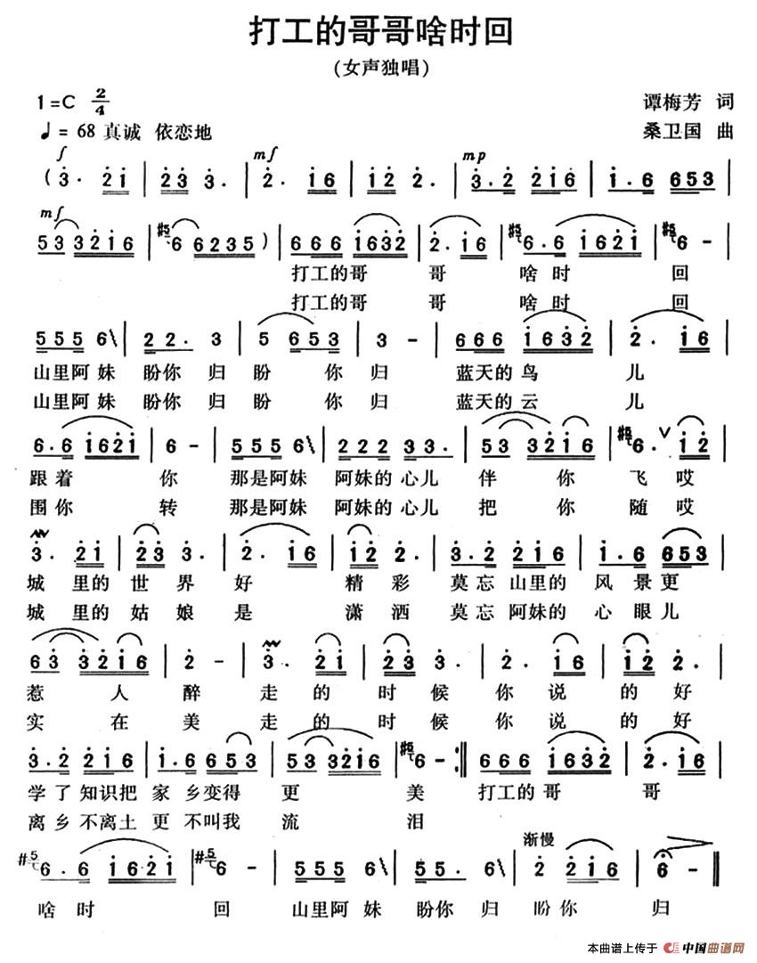 当前位置: 首页 民歌曲谱 八字歌名 打工的哥哥啥时回(谭梅芳词 桑卫国曲)