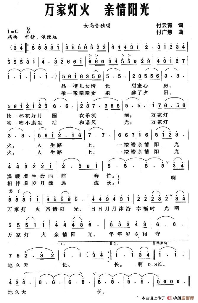 当前位置: 首页 民歌曲谱 八字歌名 万家灯火 亲情阳光(付云青词 付广慧曲)