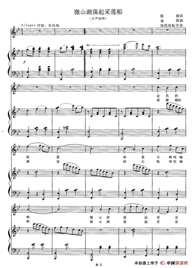 彭丽媛1980年参加全国民族民间唱法汇演,首唱了这首《微山湖荡起采莲船》及《青蓝蓝的河》轰动北京,在全国崭露头角。