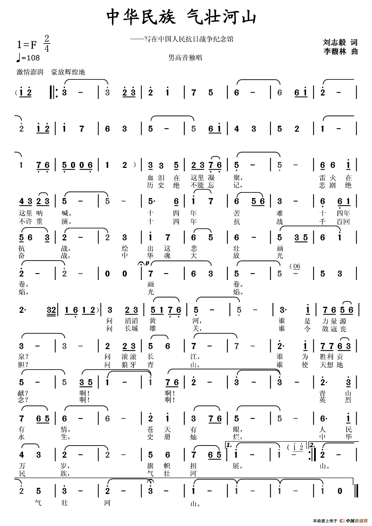 致谢:《中国曲谱网》衷心感谢作者老师馈赠原版歌谱!