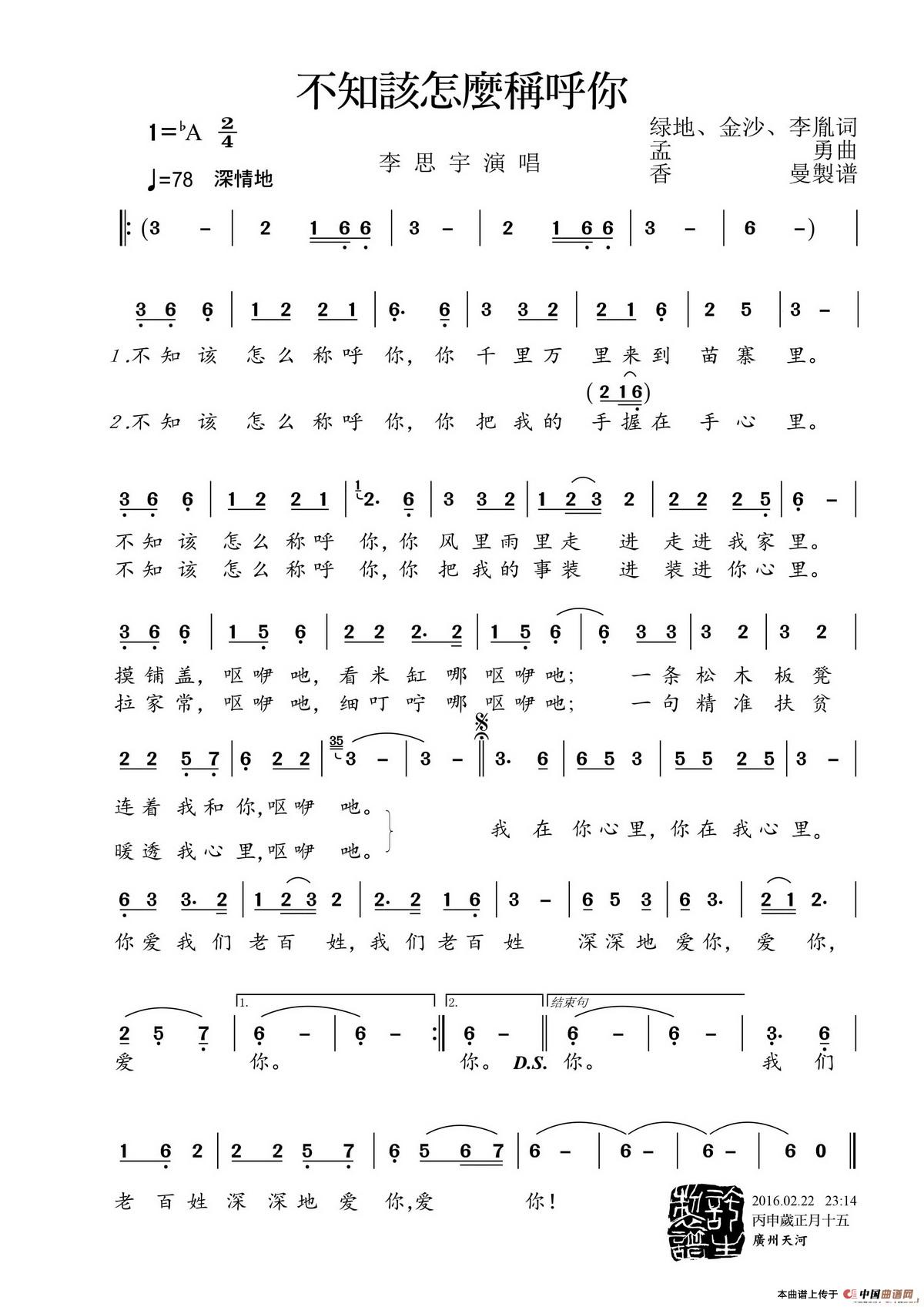 作词:绿地、金沙、李胤词   作曲:孟勇   演唱(奏):李思宇   来源:香曼制谱   上传:香曼   日期:2016-02-24   浏览次数: