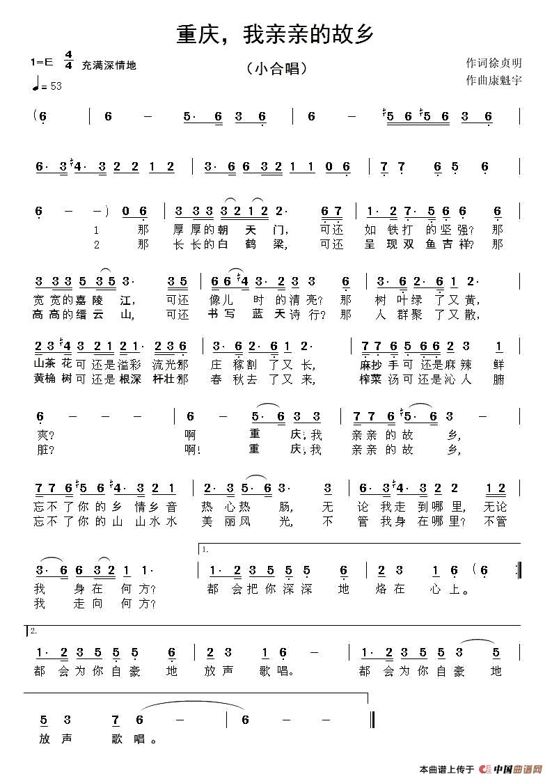 关于《重庆,我亲亲的故乡》曲谱的评论
