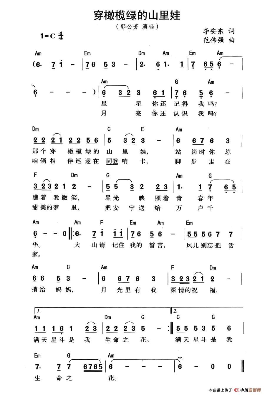 关于《穿橄榄绿的山里娃》曲谱的评论