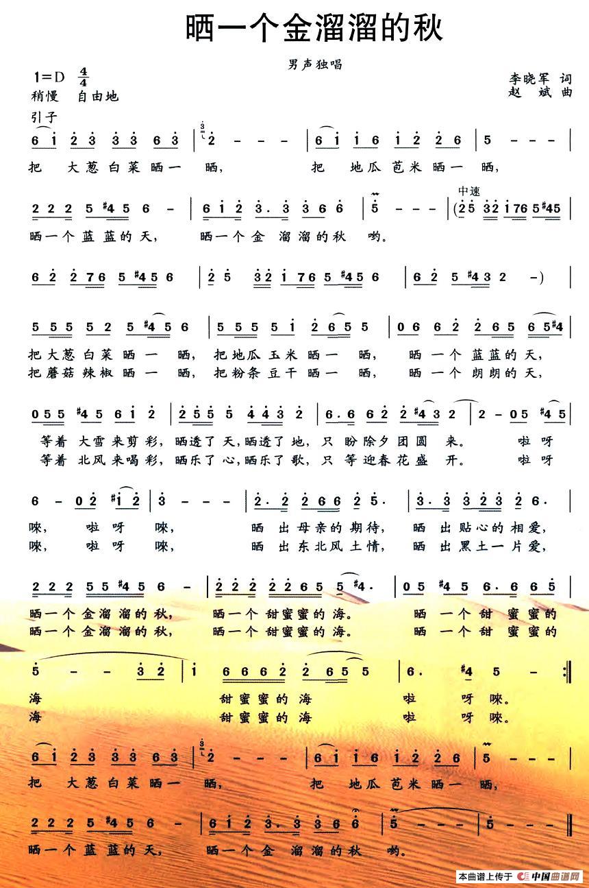 把地瓜包米晒一晒, 晒一个蓝蓝的天, 晒一个金溜溜的秋哟。 把大葱白菜晒一晒, 把地瓜包米晒一晒, 晒一个蓝蓝的天, 等着大雪来剪彩, 晒透了天晒透了地, 只盼除夕团圆来, 啦呀来, 晒出母亲的期待, 晒出贴心的相爱, 晒一个金溜溜的秋, 晒一个甜蜜蜜的海哎, 啦呀来。 把蘑菇辣椒晒一晒, 把粉条豆干晒一晒, 晒一个朗朗的天, 等着北风来喝彩, 晒乐了心晒乐了歌, 只等迎春花盛开。 啦呀来, 晒出东北风土情, 晒出黑土一片爱, 晒一个金溜溜的秋, 晒一个甜蜜蜜的海, 啦呀来。 把大葱白菜晒一晒, 把地瓜包米晒一晒, 晒一个蓝蓝的天, 晒一个金溜溜的秋哟。 |