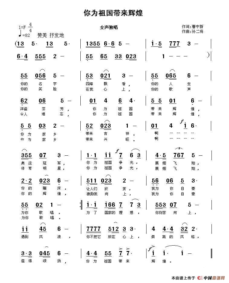 2009年11月26日,北京奥运女子蹦床冠军何雯娜荣旋莒村祭祖,作者有幸受邀前去摄像,他与何雯娜及其母亲得以沟通,闲话了家常。何雯娜淳朴甜美的微笑,体育明星的风采,给人们留下了深刻的美好印象。奥运冠军辉煌,激励着家乡人民……带着崇敬奥运冠军的激情,作者萌发了创作灵感,写下了《祖国的骄傲》、《你为祖国带来辉煌》这二首歌,表达了自己对体育明星何雯娜的崇敬和衷心的祝愿!