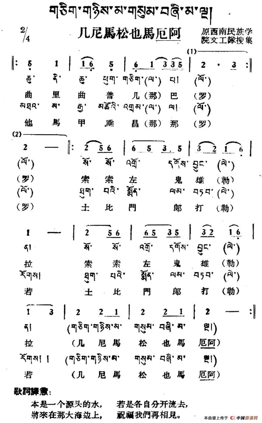 几尼马松也马厄阿(藏族民歌、藏文及音译版)