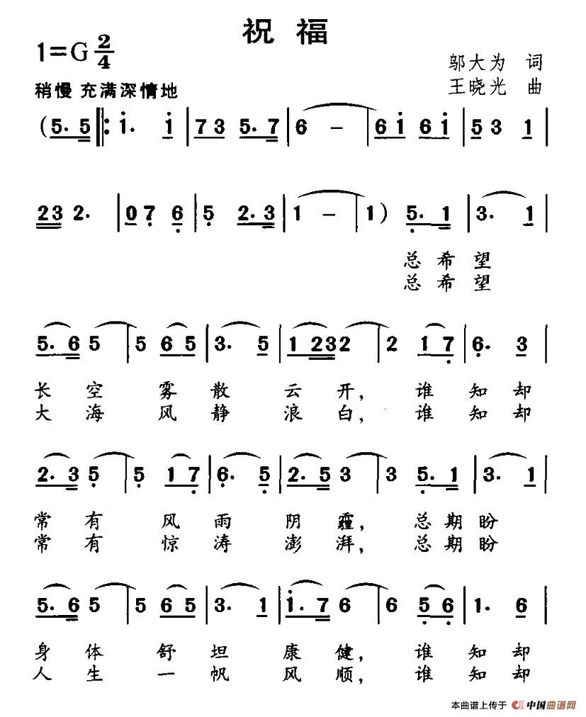 当前位置: 首页 民歌曲谱 二字以下 祝福(邬大为词 王晓光曲)
