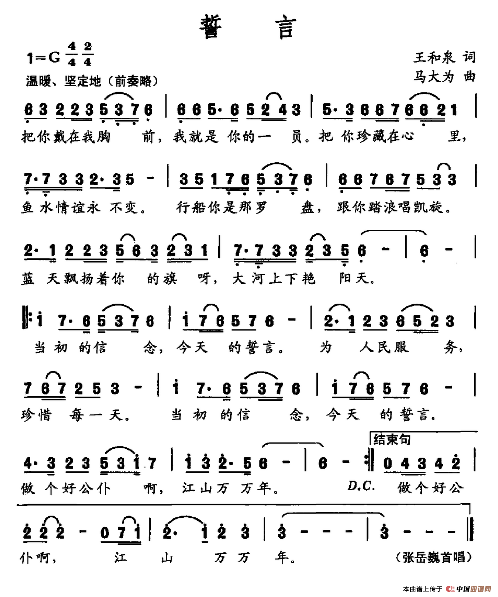 词作者说明:《誓言》原名《为人民服务》,因至今为这首词谱曲演唱的人很多,为避免混淆特地改了题目。此歌的演唱者系我们安徽很有作为和前途的青年男高音歌手张岳巍。