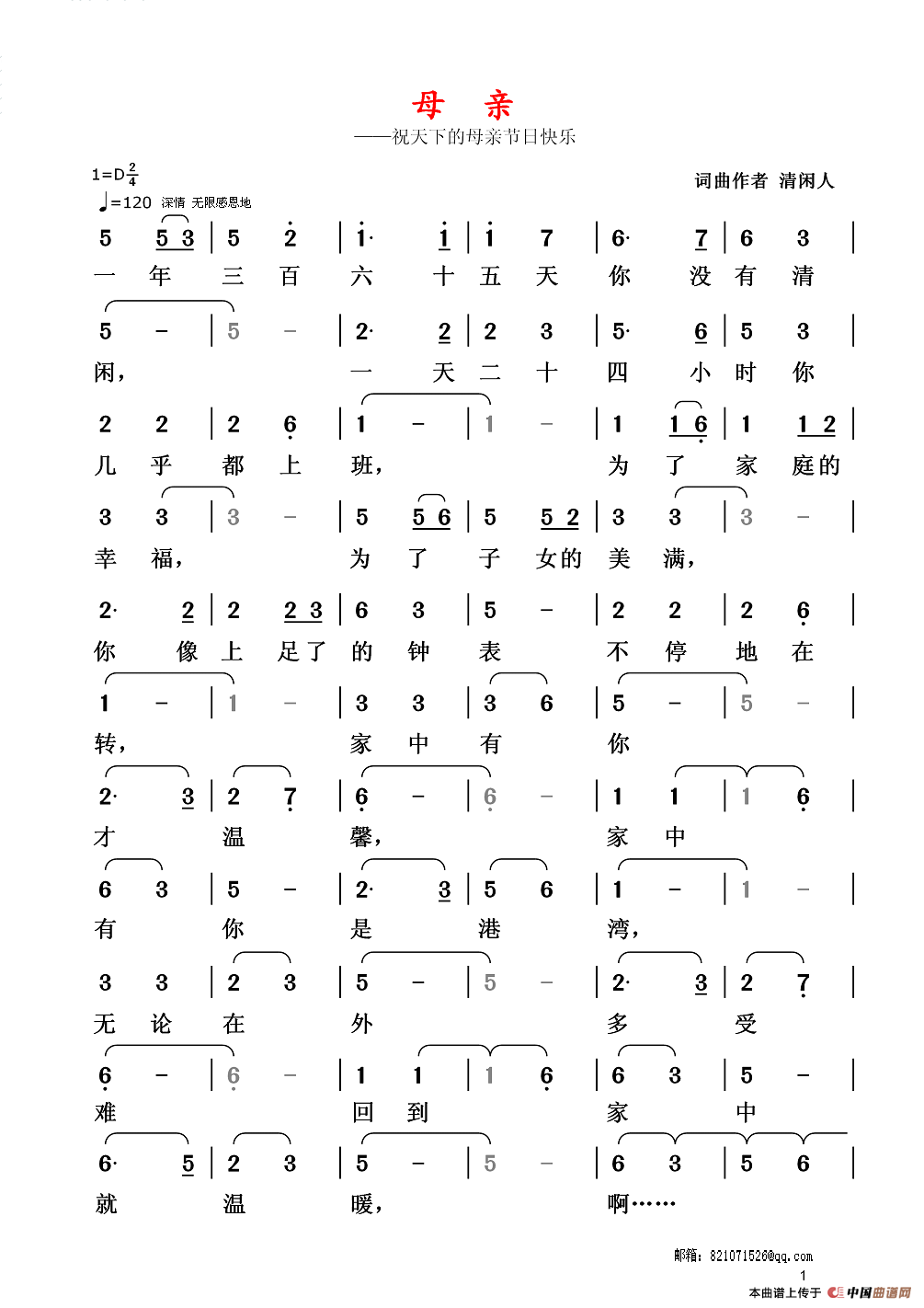 一年三百六十五天你没有清闲,一天二十四小时你几乎都上班,为了家庭的幸福,为了子女的美满,你像上足了的钟表不停地在转,家中有你才温馨,家中有你是港湾,无论在外多受难回到家中就温暖,啊……啊……母亲是家庭的承载,母亲是儿女们的依恋,只要有母亲撑着,家就永远是幸福的乐园。