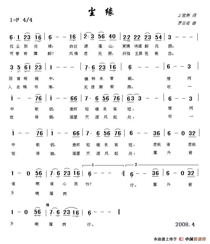 上官燕/词 罗云进/曲 红尘何处缘? 昨日渡蓬山, 更携诗酒醉花颜。 回首明镜中, 辗转未曾眠。 想网中歌侣, 邀杯轻嗟良宵短, 思我谁谁心犹怜? 可曾有薄醉? 风情思无限, 纤指玉屏芭蕉怨。 人去锦书难, 无语廊前燕。 叹一世徘徊, 遥望天涯风起处 , 塞外君乡雁两行。 |