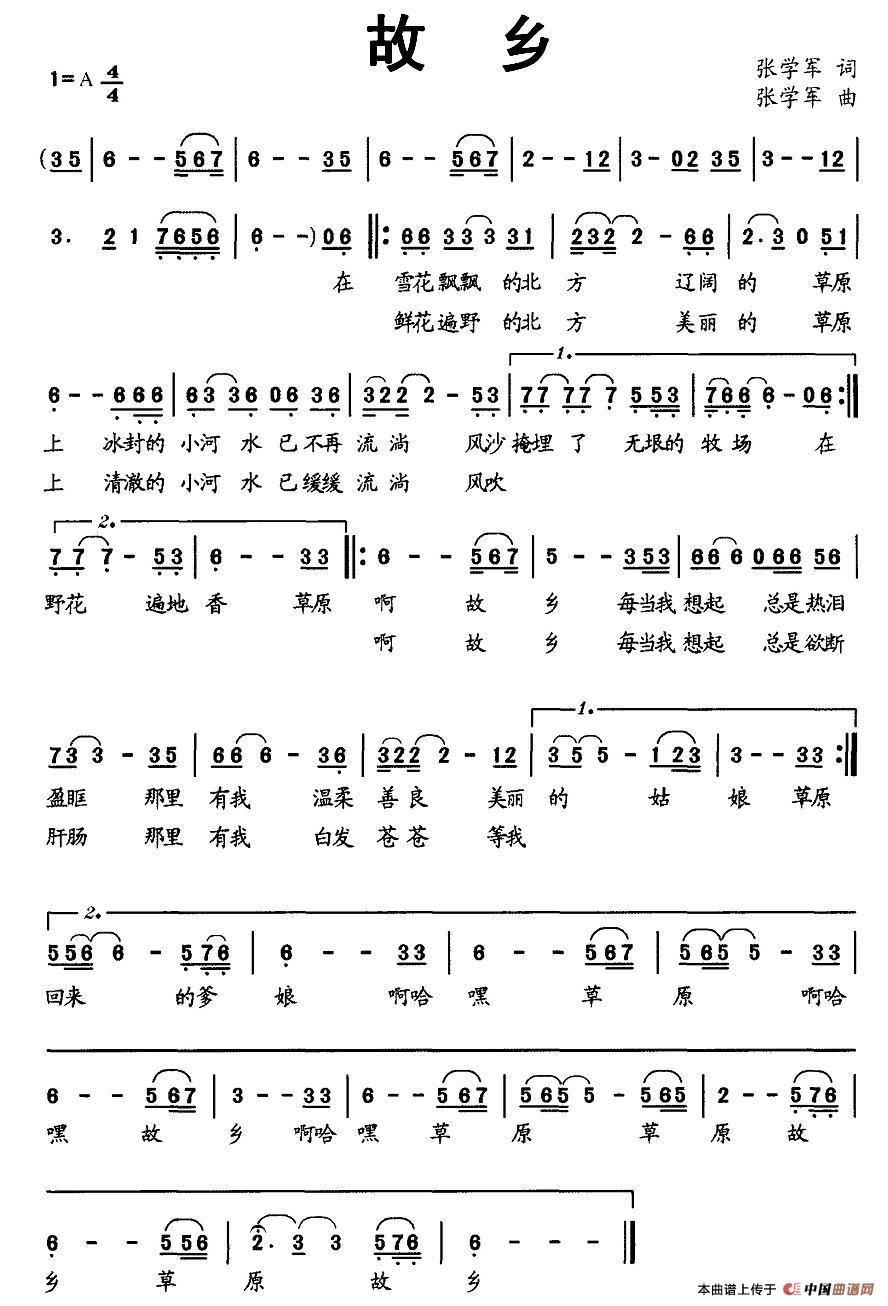 当前位置: 首页 民歌曲谱 二字以下 故乡(张学军 词曲)
