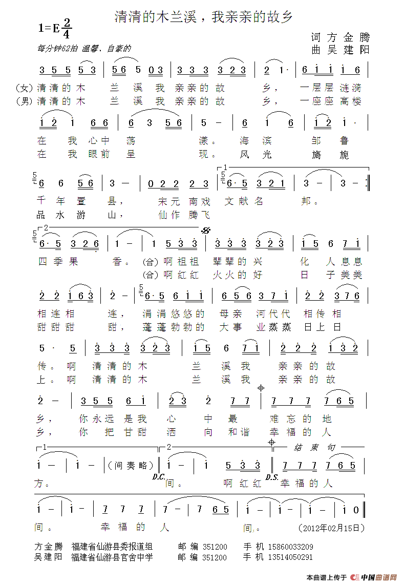 《清清的木兰溪,我亲亲的故乡》创作于2012年2月份。2012年6月份由解放军二炮文工团女高音花之悦演唱,并由中国音乐家音像出版社公开出版发行,收入“我的家乡多么美”全国优秀原创歌曲作品集。