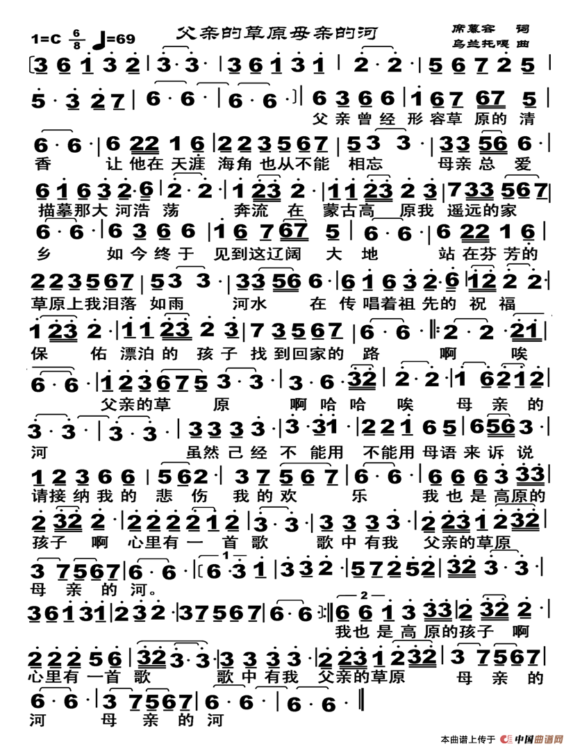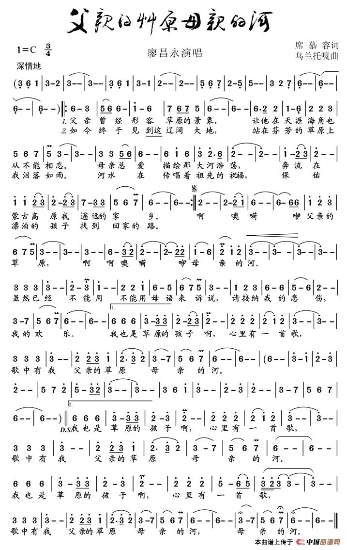 歌词应略做修改:父亲眼里无边的草原,母亲心中浩荡的河”,此处,应歌声低沉绵长,尽舒乡愁之情。 [回复]