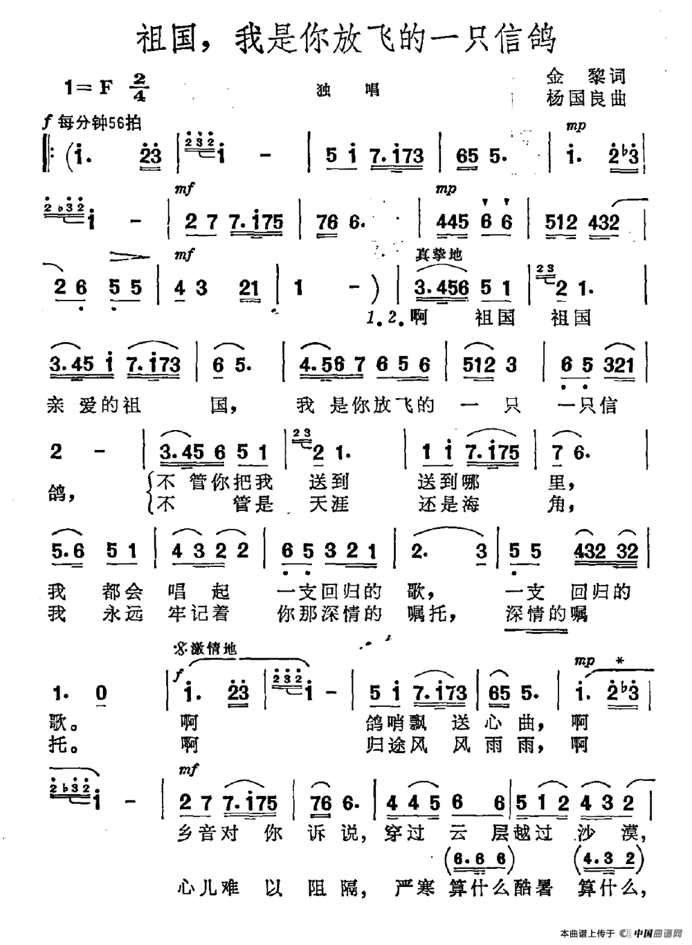 关于《祖国,我是你放飞的一只信鸽》曲谱的评论