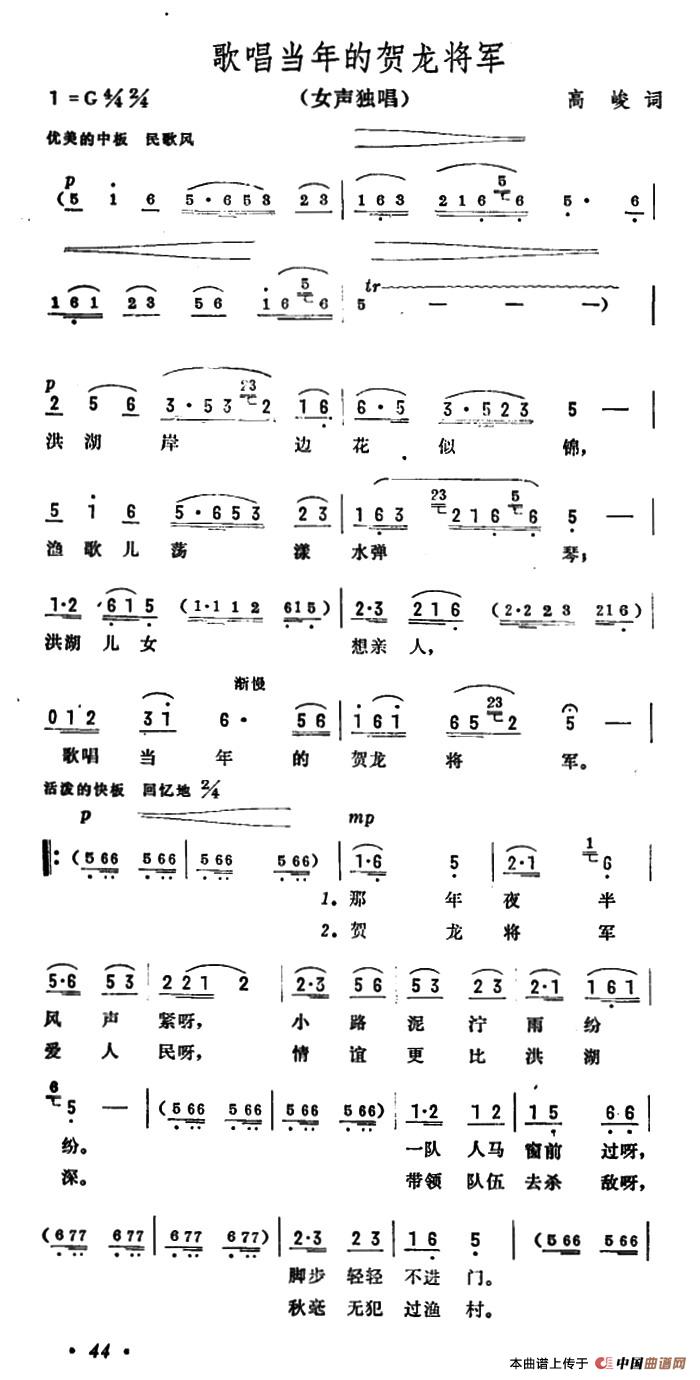 关于《歌唱当年的贺龙将军》曲谱的评论