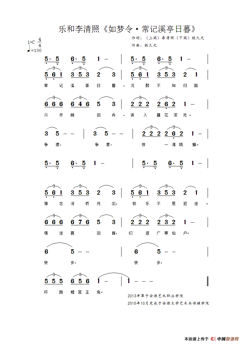 关于《乐和李清照《如梦令·常记溪亭日暮》》曲谱的评论