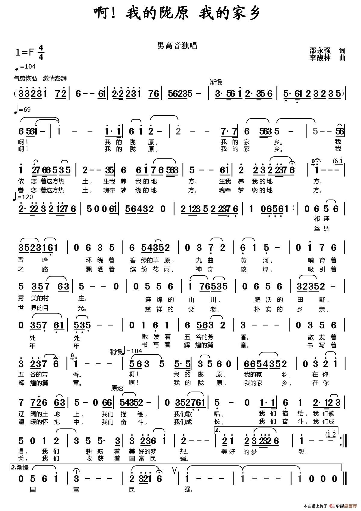 关于《啊!我的陇原 我的家乡》曲谱的评论