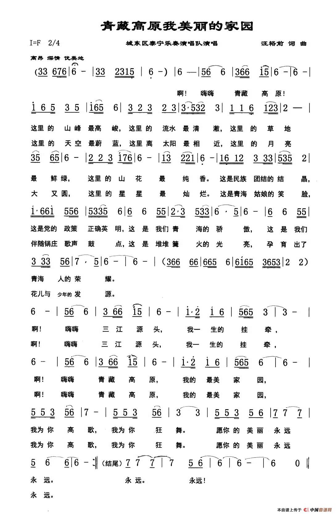 关于《青藏高原我美丽的家园》曲谱的评论