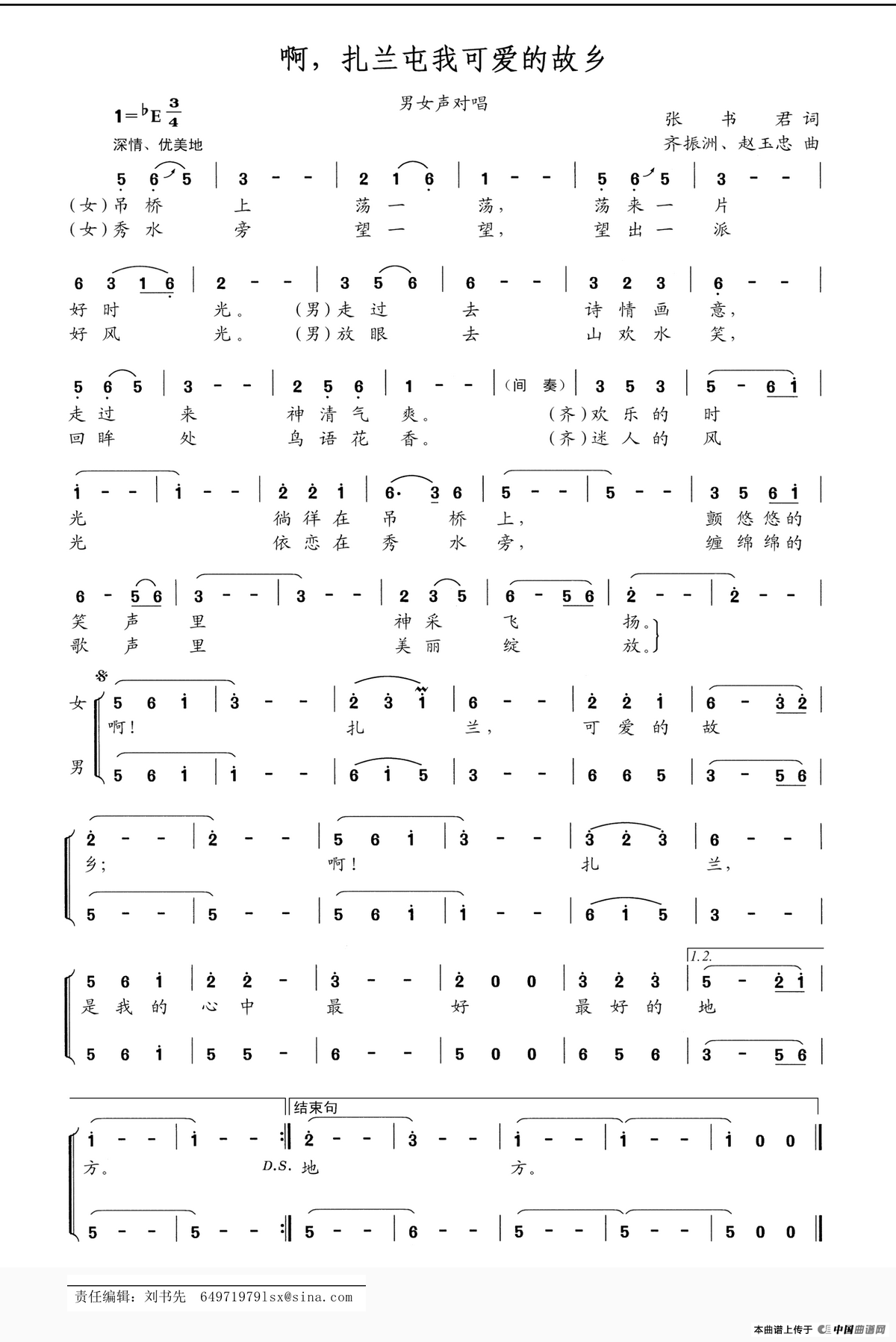 关于《啊,扎兰屯我可爱的故乡》曲谱的评论