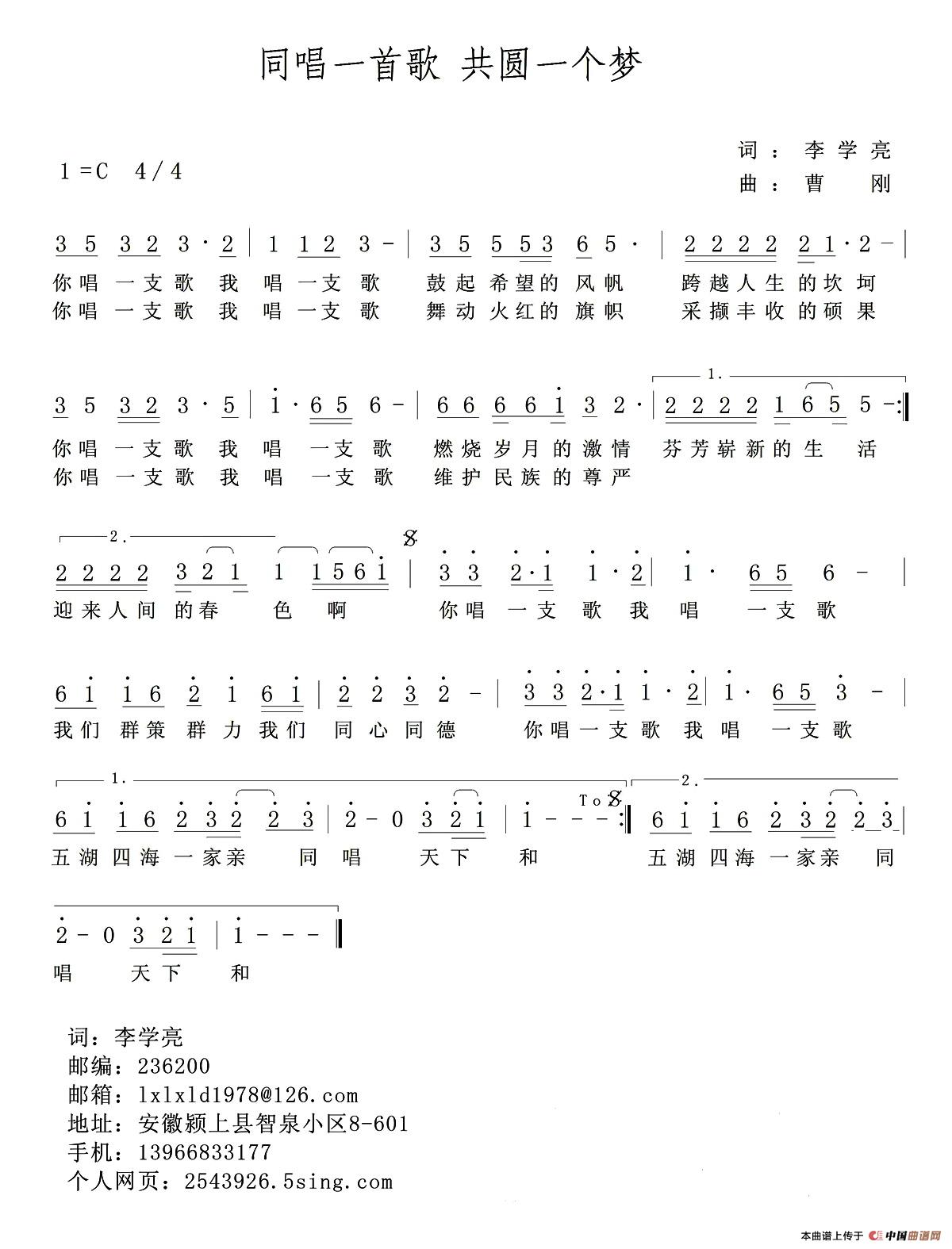关于《同唱一首歌 共圆一个梦》曲谱的评论