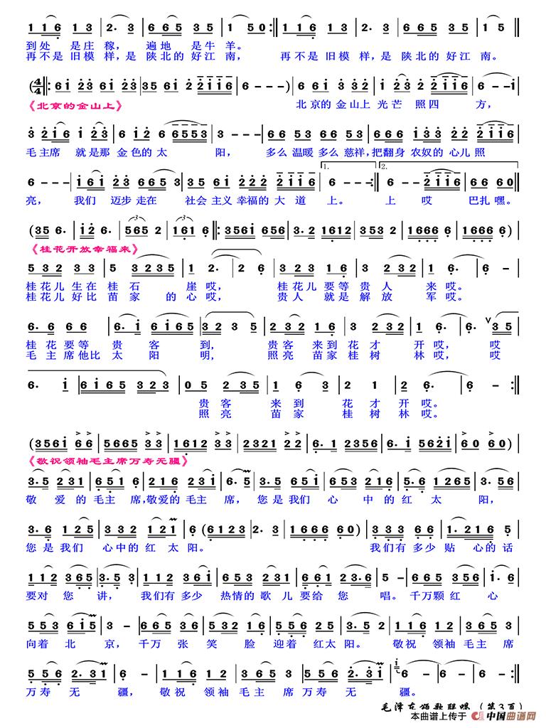 千山那个万水呀连着天安门,毛主席是咱社里人。春耕夏锄全想到,防旱排涝挂在心,八字宪法亲手订,丰产的道路细指引。