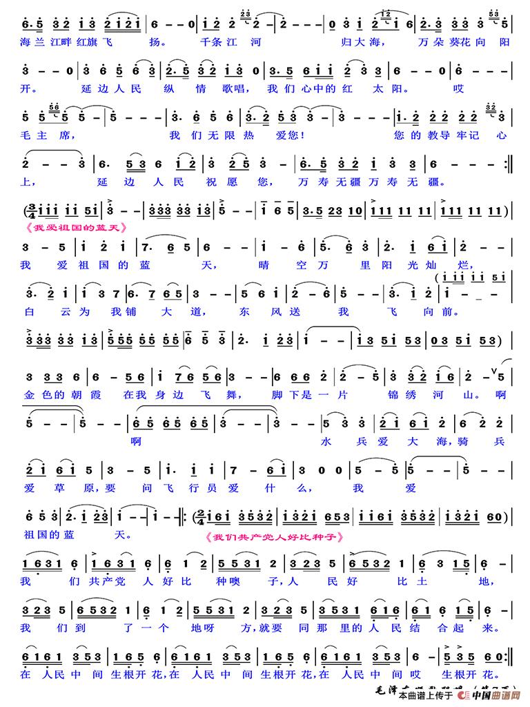 红太阳照边疆,青山绿水披霞光,长白山下果树成行,海澜江畔稻花香,劈开高山大地献宝藏,拦河筑坝引水上山岗,哎咳...延边人民斗志昂扬,军民团结建设边疆,毛主席领导我们胜利向前方。