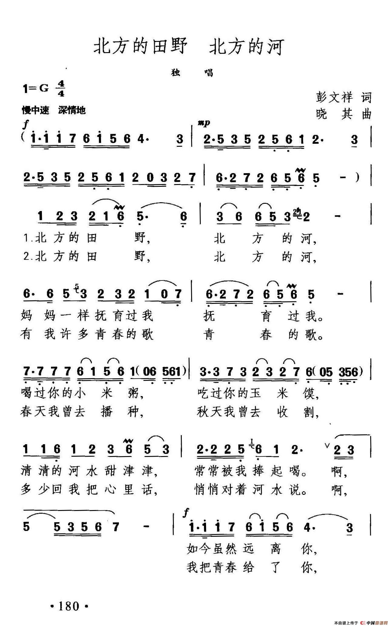 《北方的田野,北方的河》文本歌词