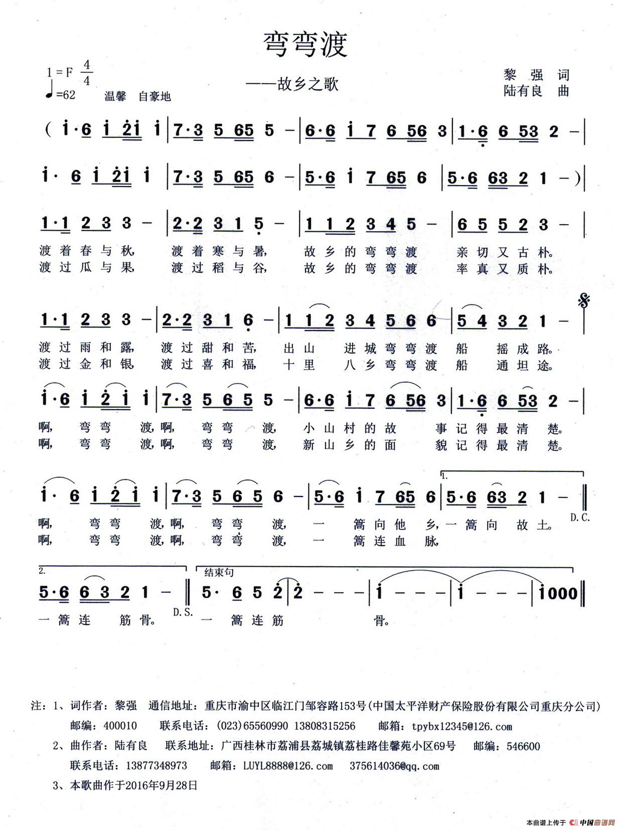 关于《弯弯渡(又名:故乡之歌)》曲谱的评论