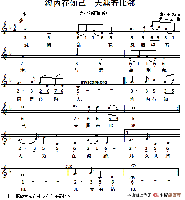 关于《海内存知己 天涯若比邻》曲谱的评论