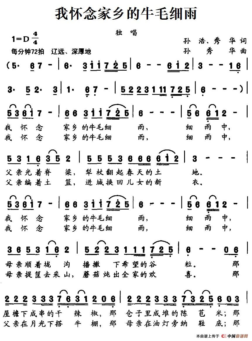 关于《我怀念家乡的牛毛细雨》曲谱的评论