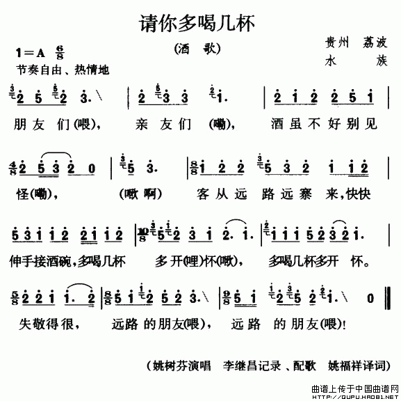 这是一首贵州荔波水族的酒歌。水族大部分居住在贵州东南部三都、荔波、独由、黎平等县,少数散居于广西南丹、环江、河池等地,人口约34万。语言属汉藏语系壮侗语族侗水语支,无常规文字,仅有用于宗教的“水书”。