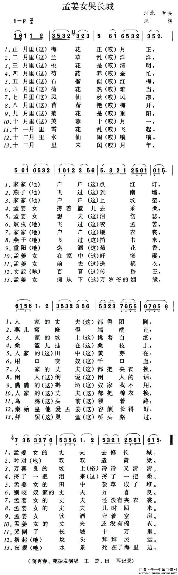 这是一首河北晋县的民间小调,它的流传与《茉莉花》有近似之处,也遍传于全国汉族聚居地区,但二者也有不同之处是《茉莉花》以“变体”的流传居多,而《孟姜女》则主要以“同体”在各地传唱。江南《孟姜女》的唱词是“四季体”,而河北这首《孟姜女》的唱词为“十二月体”。