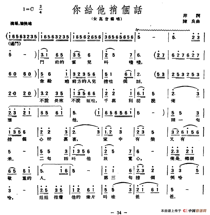 关于《你给他捎个话》曲谱的评论