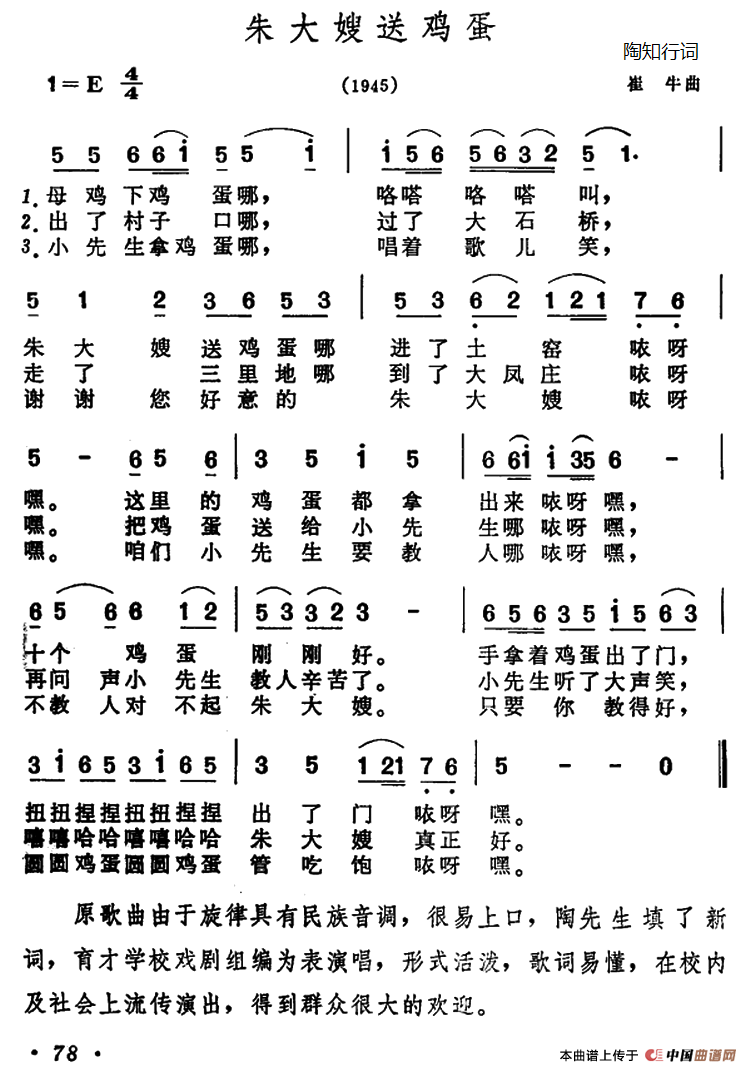 关于《朱大嫂送鸡蛋》曲谱的评论