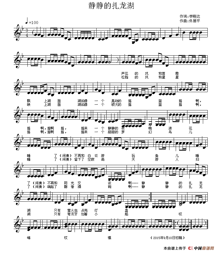 感谢秋叶起舞老师把我的这首《静静的扎龙湖》歌谱转发于贵网。但我的谱子制作还是不够标准,请谅解。 [回复]