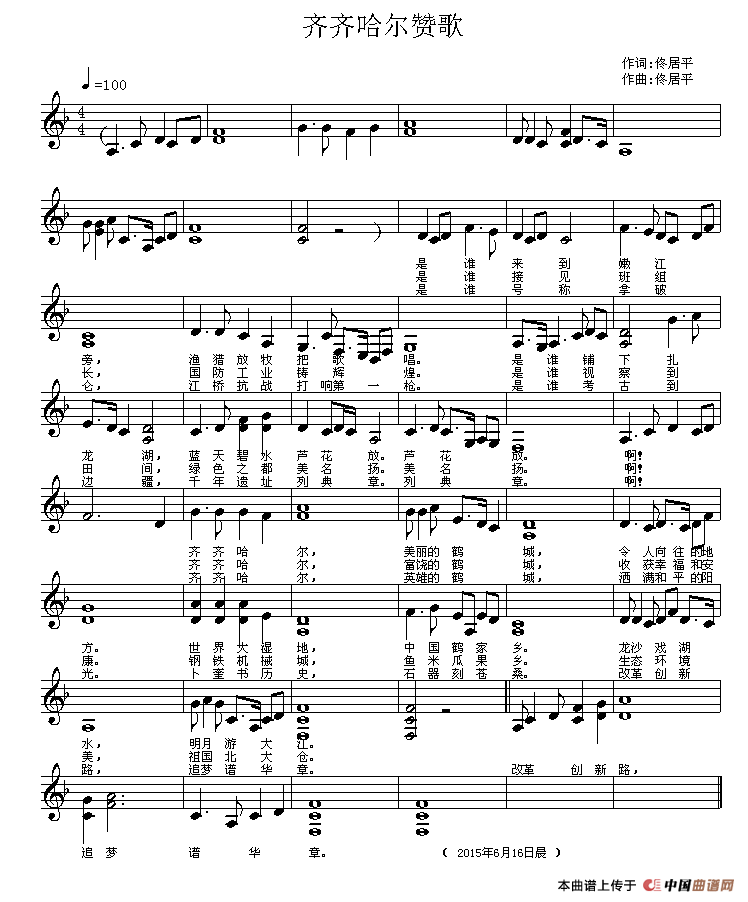(歌词完成于2015年6月16日晨7:00;谱曲完成于2015年7月2日)