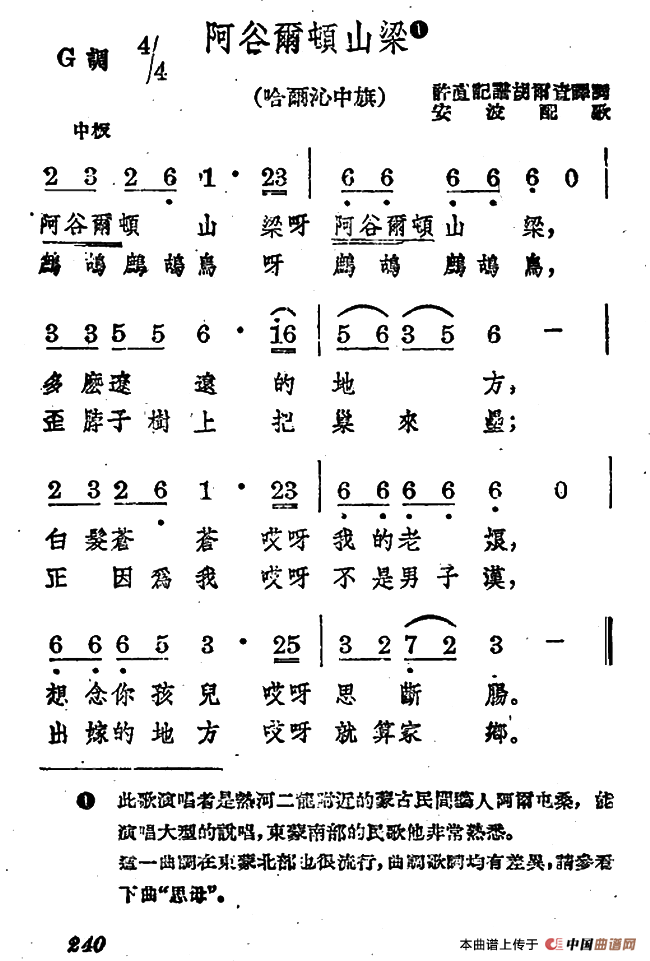 选自安波·许直编著《东蒙民歌选》1952年版,许直记谱,胡尔查译词,安波配歌。
