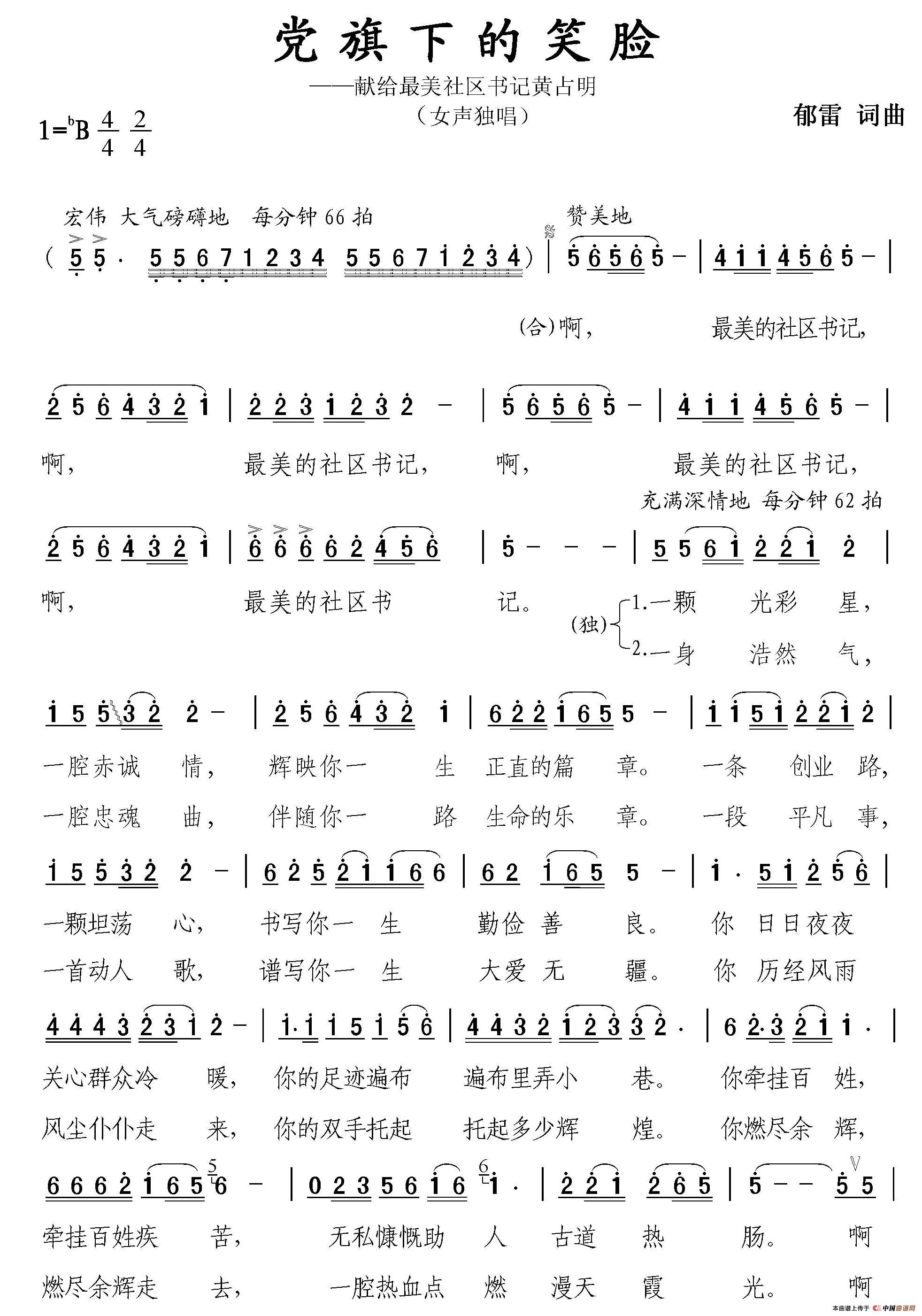 2013年5月,各大新闻媒体纷纷转载了《一个社区书记病逝的消息为什么让整个海门市悲伤?》的报道,人民网的中国共产党新闻也转发了《新华日报》的系列报道《“下辈子,我还给大伙当支书”——追记海门三厂工房街社区支部书记黄占明》。作为他的同乡人,我写下这首《党旗下的笑脸》(《最美社区书记》)的歌曲,并通过公演,抒发我对黄占明同志的敬佩之心、怀念之情。我要用我的这首歌曲塑造黄占明平凡而又伟大的一生、质朴而又高大的形象,唱出老百姓对最美社区书记的呼唤,传颂黄占明同志可歌可泣的感人事迹,让他的事迹千古流传,让他的英名万世流芳!