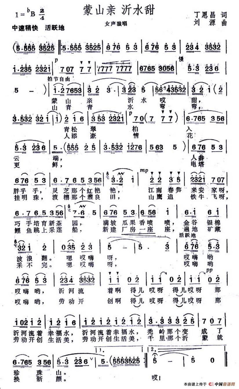刘源:山东省资深作曲家,《蒙山亲沂水甜》首发《山东歌声》1981年第1期,上海唱片社并录制唱片,1982年人民音乐出版社编入《农村歌曲集》并由裘柳钦主编选入《北京舞蹈学院课堂实用教材》及《中国民间舞曲精选》、中国文联出版社1993年出版等,中央及省电台多年播放。著名歌唱家韦友琴、王朴琴、徐静等也演唱过该作品。这是1980年电台广播时用录音机录下的,感谢作曲家李华野处理并提供音频资料。王月华、翟琪等也演唱过该歌。