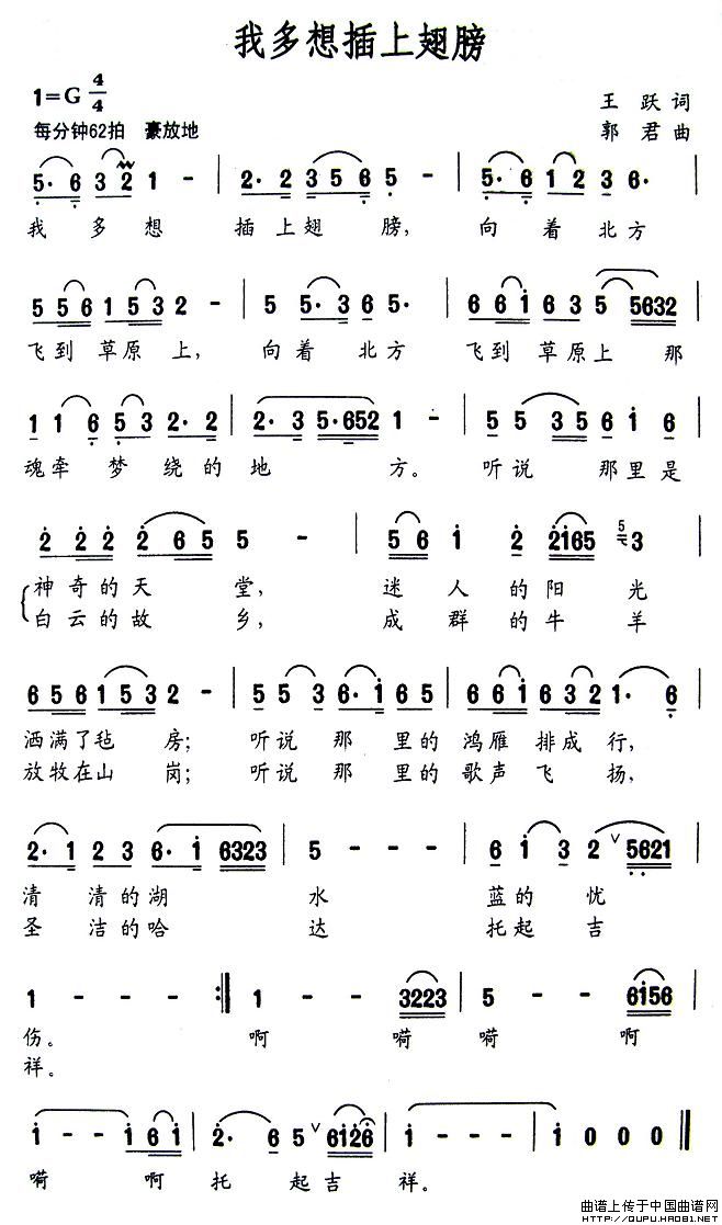 1,我多想插上翅膀, 向着北方飞到草原上。