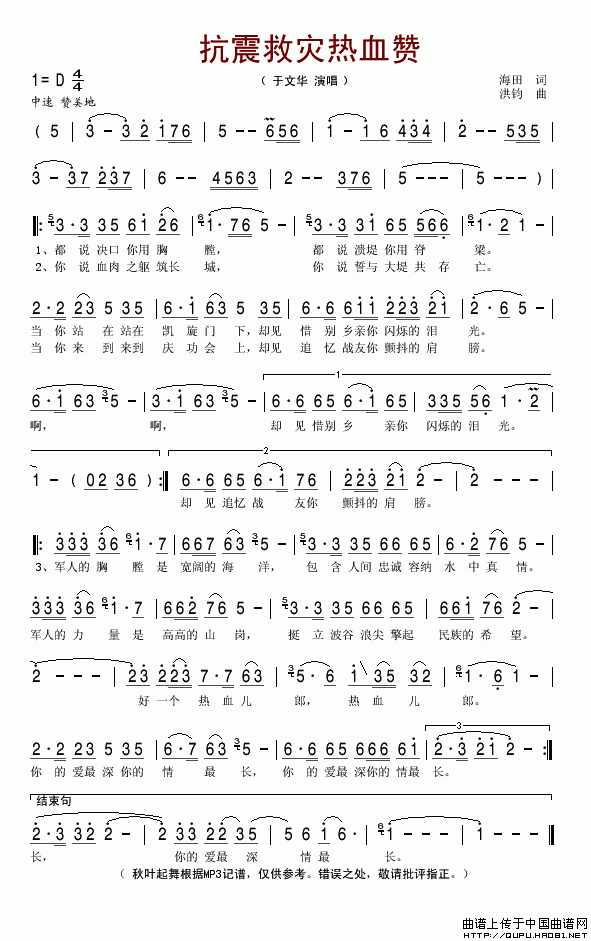 关于《抗震救灾热血赞》曲谱的评论