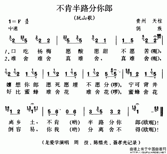 这是一首侗族民歌。侗族分布在贵州东南部和湖南、广西毗邻地区,人口约151万,语言属汉藏语系壮侗语族侗水语支,无文字,通用汉文。