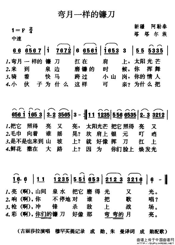 这是一首塔塔尔族民歌。该族的民歌主要有“抒情歌曲”、“劳动歌曲”和“习俗歌曲”三类。《弯月一样的镰刀》的四段唱词充满激情地歌颂了塔塔尔族男青年的勇敢、英武和豪迈。