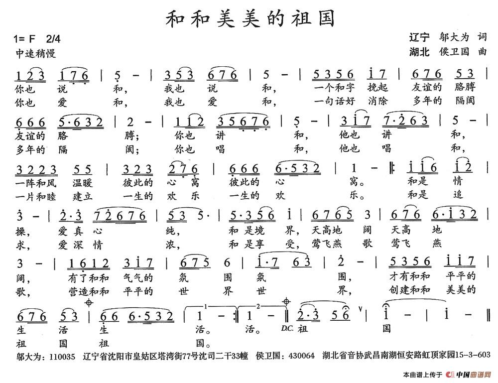 《和和美美的祖国》,邬大为词 侯卫国曲,由中国煤矿文工团著名女独唱演员檀欢欢演唱。此歌荣获"唱响心中的歌"感动中国第七届全国新创词曲选拨活动一等奖。