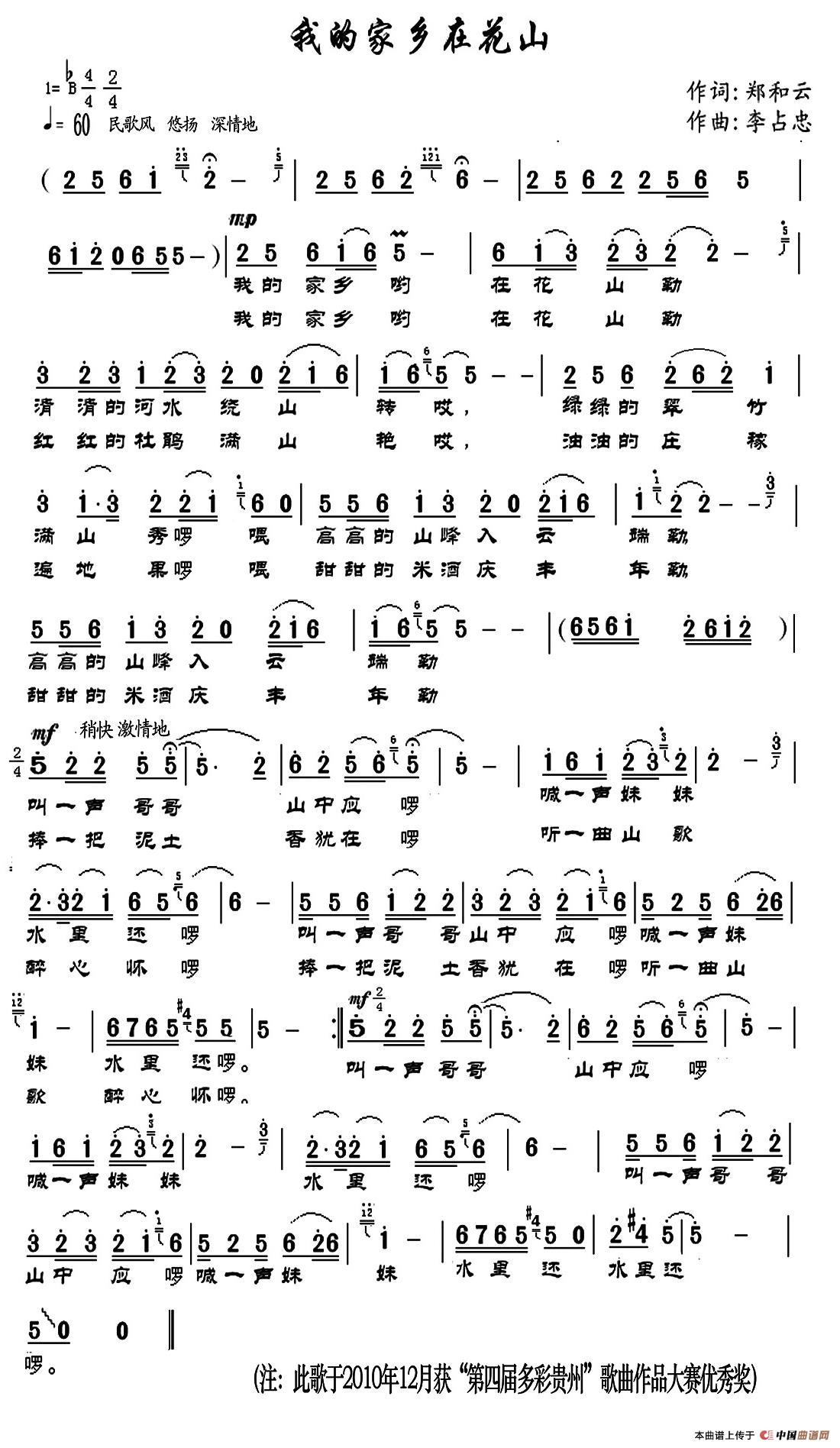 “花山”、“麻山”是贵州省西南部著名的两山。花山地域山清水秀、四季花开。歌曲《我的家乡在花山》采用布依族民间音调作素材,加以现代手法演绎创作而成,曲调优美、旋律动听,咏唱出浓浓的乡音乡情,描绘出一幅“人在花中走,花与人同醉”的自然景观。