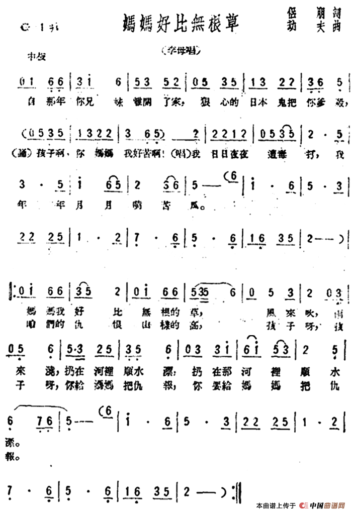 关于《妈妈好比无根草》曲谱的评论