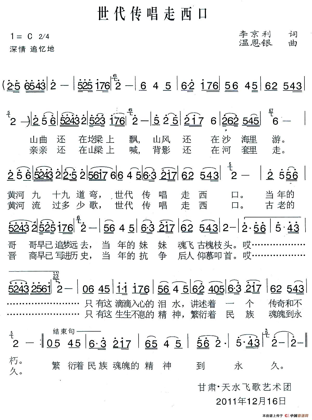 关于《世代传唱走西口》曲谱的评论