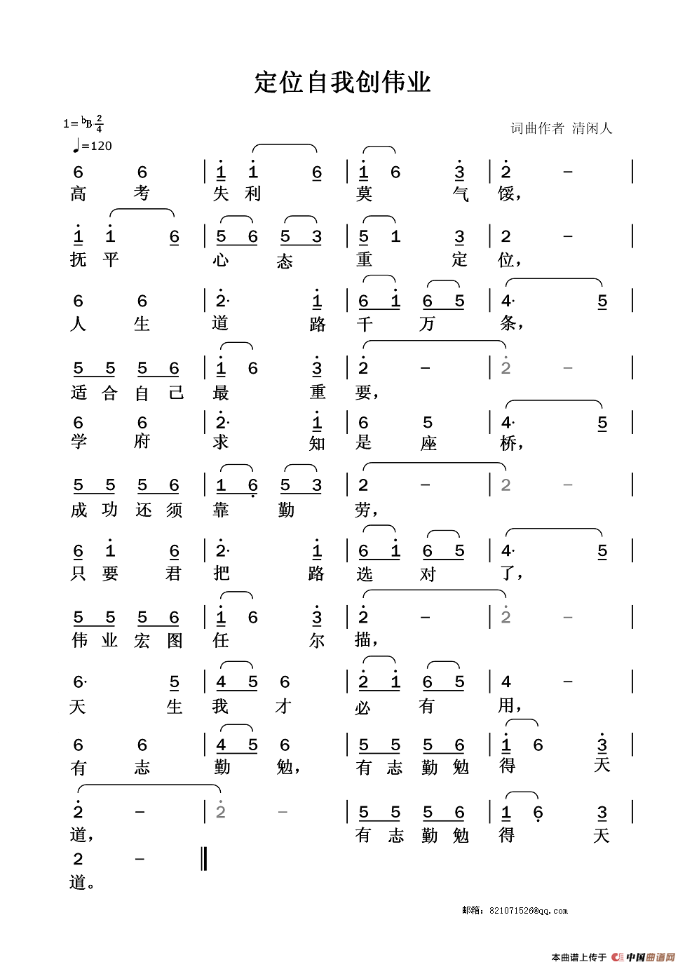 高考失利莫气馁,抚平心态重定位,人生道路千万条,适合自己最重要,学府求知是座桥,成功还须靠勤劳,只要君把路选对了,伟业宏图任尔描,天生我才必有用,有志勤勉,有志勤勉得天道,有志勤勉得天道。