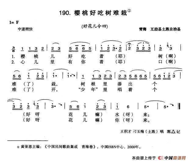 樱桃好吃树难栽(选自《中国花儿曲令全集》)