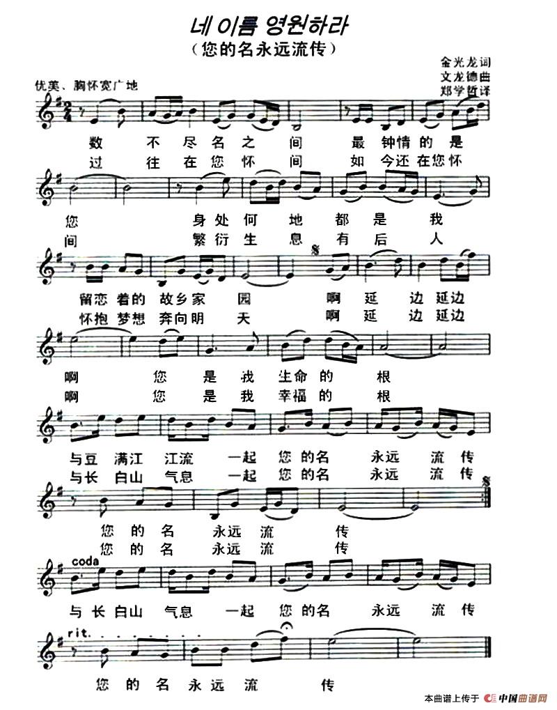 “您的名永远流传”是金光龙老师最新创作的又一朝鲜族音乐力作,现予中文翻译。